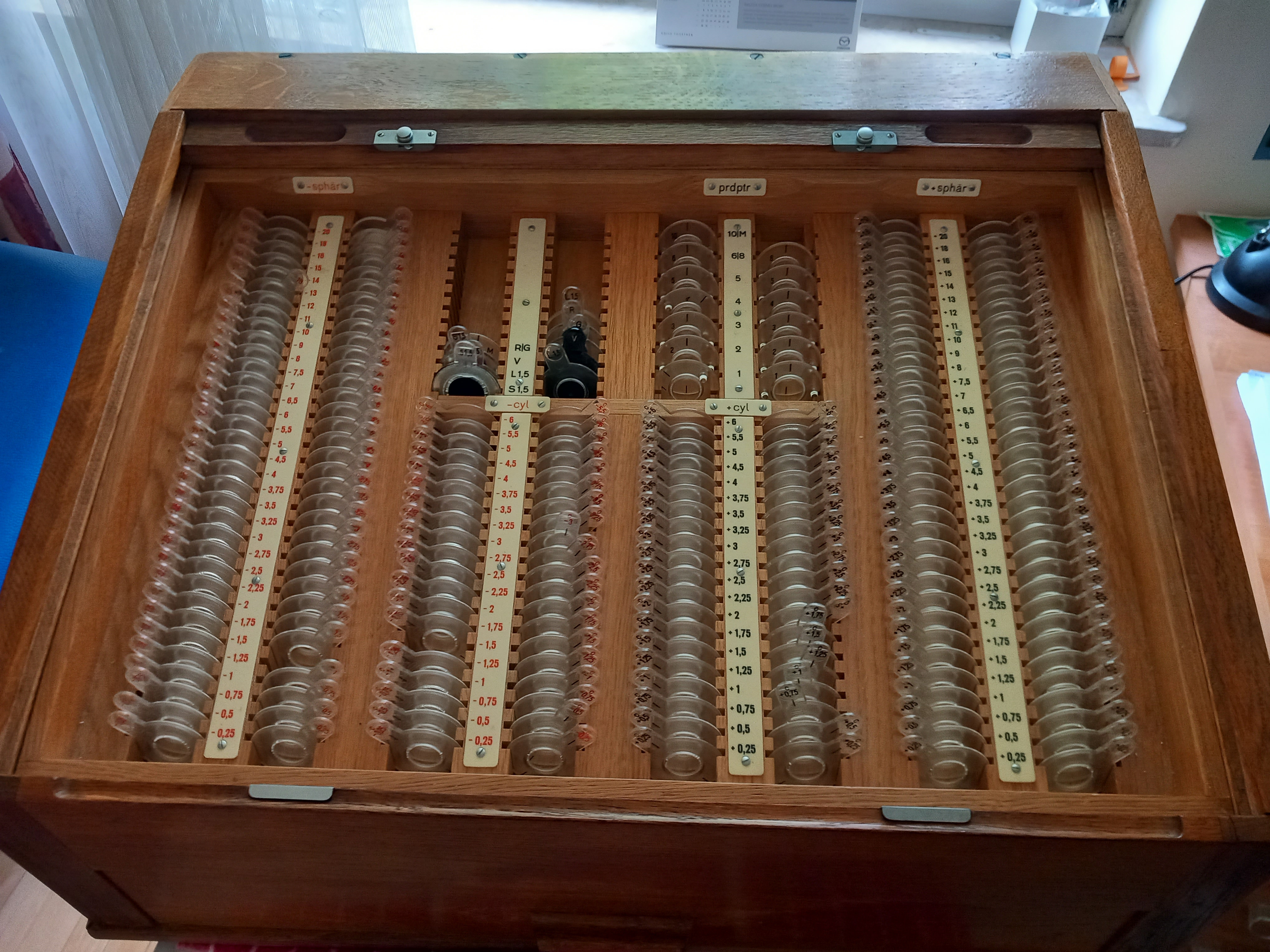 Sprzedam kasetę okulistyczną ze szkiełkami do badania ostrości wzorku. Kaseta drewniana z rozsuwanym wiekiem z dodatkową szufladą. Dodatkowo kasetka ze szkiełkami i regulowanymi oprawkami drucianymi. W bardzo dobrym stanie